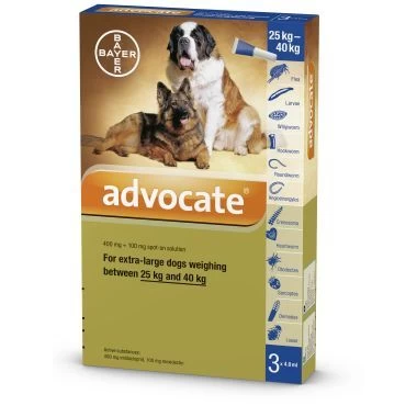 Advocate Spot-on for Extra Large Dogs treats animals weighing 25-40kg. Manufactured by Bayer Animal Health.