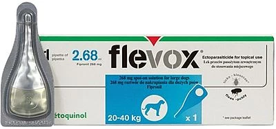 Flevox Spot-on Large Dog 20-40kg is for the treatment of flea and biting/chewing lice infestations in dogs. Flevox for Dogs is also for the prevention of ticks, and can be used as part of a treatment strategy for Flea Allergy Dermatitis, where this has been previously diagnosed by a veterinary surgeon.Â